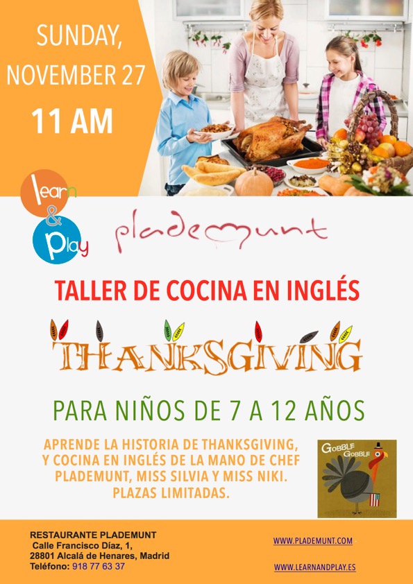 El domingo 27 a las 11:00h de la mañana nos pondremos a preparar un suculento banquete de cocina americana para celebrar el Thanksgiving. Taller de cocina en inglés de la mano de la academia Learn and Play, con Silvia Meruelo y el equipo de Plademunt, el Restaurante Imaginario.